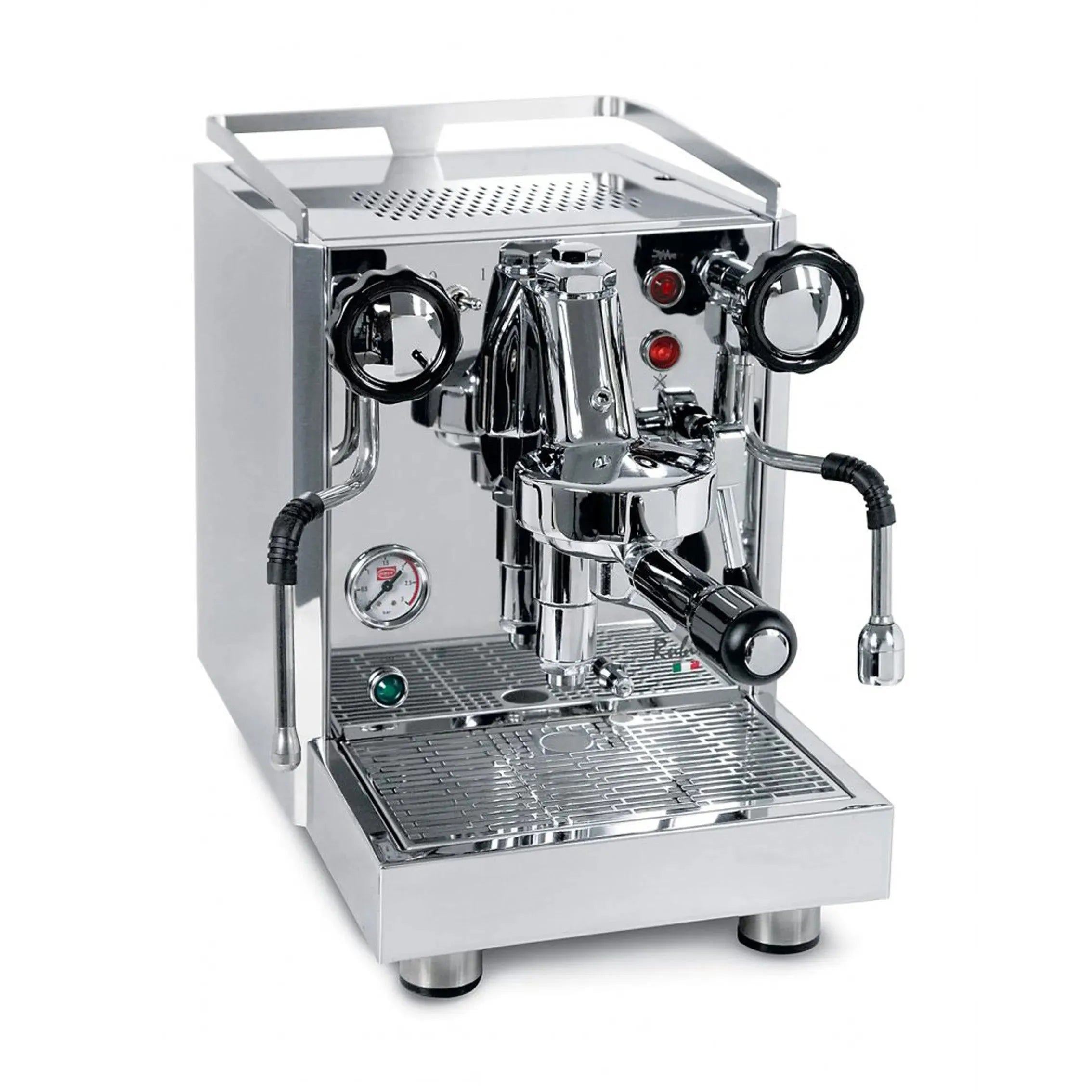 Bei der Entwicklung der 0981 Rubino hatte Quick Mill ein klares Ziel: Ein erschwinglicher Zweikreiser mit E61-Brühgruppe, der keine Kompromisse in der bekannten Quick Mill-Qualität eingeht. Das gradlinige Gehäuse aus ferritischem Edelstahl ist kosteneffizient, da es ohne aufwendige Rundungen auskommt. Ein Manometer zeigt den Kesseldruck und die Betriebsbereitschaft der Maschine an.