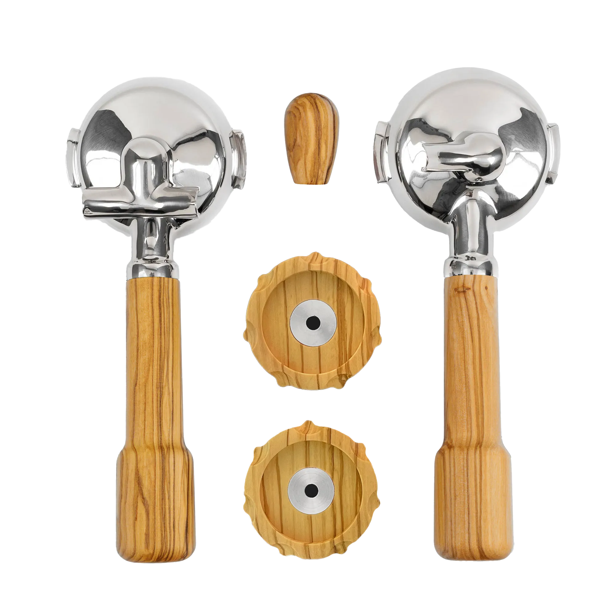 Griffset bestehend aus: 1x Siebträger classic 2er Edelstahl, 1x Siebträger classic 1er Edelstahl, 2x Pro400 Drehrad, 1x universal Kipphebel. Passend für: Profitec Pro400